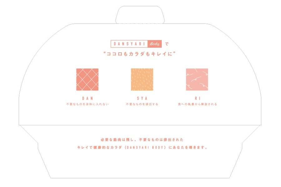 商品名である断・捨・離をそれぞれ模様として可視化しデザインしました。ターゲットが女性の機能性表示食品 なので、ロゴ周りには信頼感・清潔感を出しながらも、全体は柔らかく可愛らしい雰囲気に仕上げました。